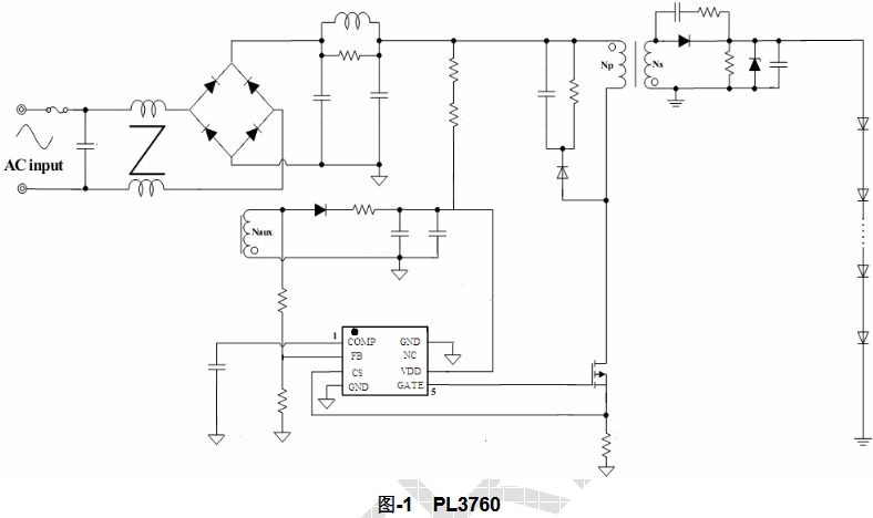 PL3760采用原边控制技术,去除了传统的次级反馈电路和光耦,这一创新设计不仅简化了电路结构,还显著降低了系统成本。通过原边控制,PL3760能够实现高精度的输出电流调节,同时保持系统的稳定性和可靠性。