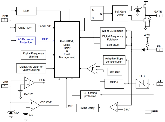 软启动功能:内置4ms的软启动时间,逐周期增大CS电流限阈值,有效降低了变压器磁饱和的风险,同时减少了次级二极管在启动时所受的应力。