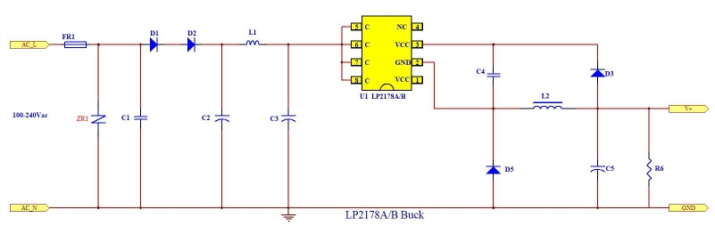 变压器通过电磁感应将输入的高电压转换为适合降压转换器处理的低电压。在本方案中,变压器将整流后的直流电压转换为适合LP2178B芯片处理的电压水平,从而实现高效的降压转换。