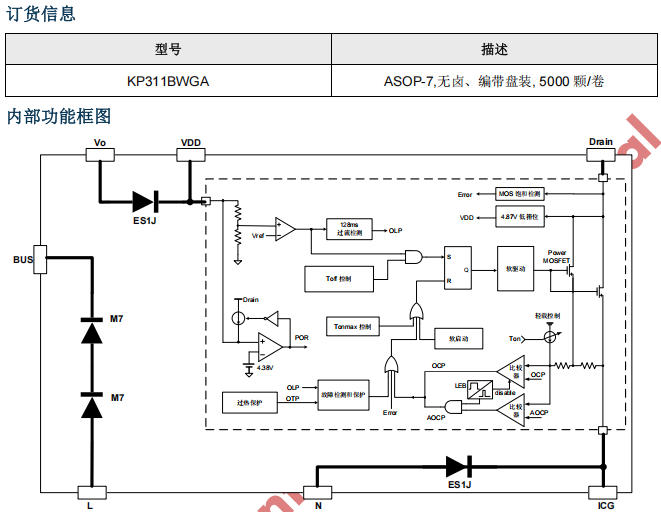 | 保护 | 7 合 1 | UVLO/OCP/OVP/OTP/OLP/LEB/自恢复 |