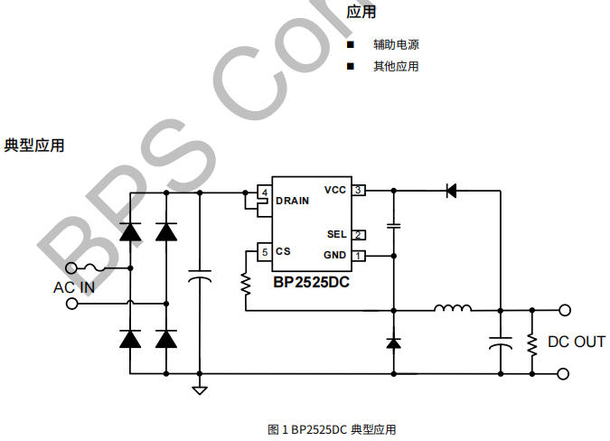 ACin → 1 A/500 V整流桥 → 4.7 µF/400 V电解 → BP2525DC DRAIN;