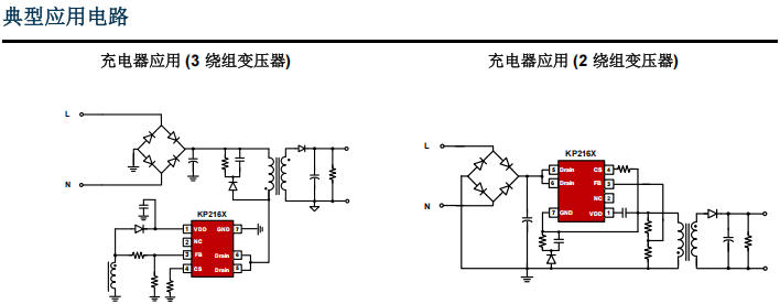 KP2161SGA 支持“无辅助绕组”方案,只要把 FB 分压到输出绕组平台,即可实现 5 V/1.5 A 或 9 V/0.8 A 快充。官方给出两张参考图: