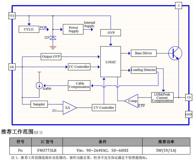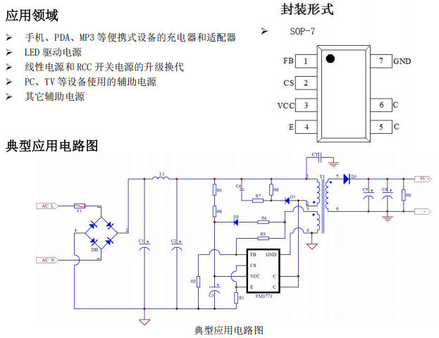 FM3773LB 是一颗 反激式隔离型原边反馈(PSR)开关电源芯片,内部集成 850 V 大功率 BJT,采用 SOP-7 封装,目标功率 5 W(5 V/1 A)。最大亮点:无需光耦、无需 TL431、无需次级电流检测,即可实现 ±3 % 恒压精度、±5 % 恒流精度,待机功耗 < 75 mW,专为手机充电器、LED 驱动、机顶盒辅助电源等“空间小、成本低、交期紧”场景设计。