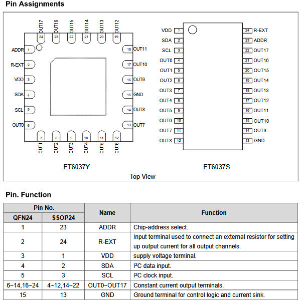 ET6037S 把「18 路恒流源 + 128 级 PWM + I²C 四地址 + RGB 分组」浓缩进 4×4mm 的 QFN24 或 SSOP24: