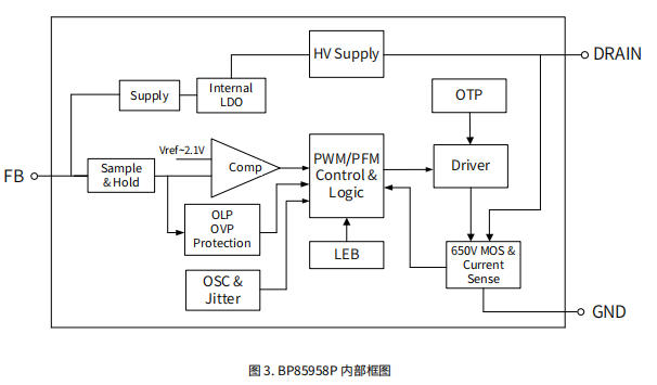 BP85958P用一颗DIP7就把650V MOSFET、高压启动、固定12V反馈、全套保护全部集成:
