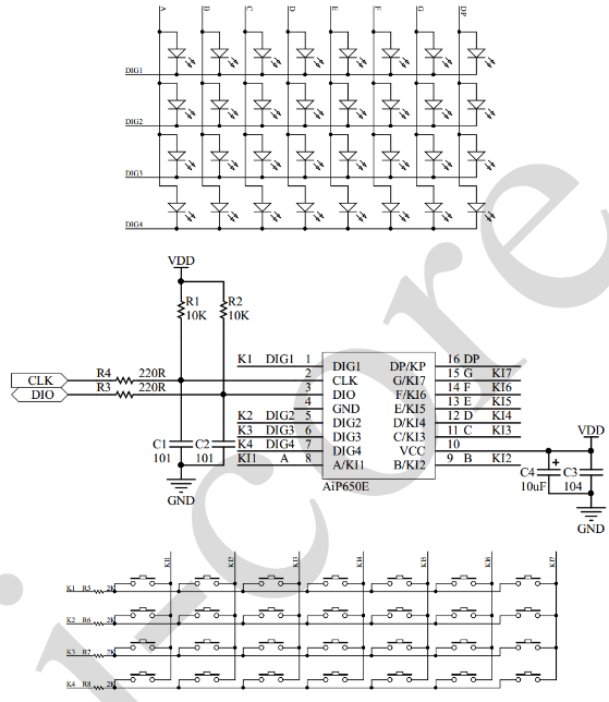 AiP650E是一款带键盘扫描电路接口的LED驱动控制专用电路,内部集成: