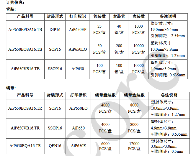 | DIP16 | AiP650EP | P=Plastic封装,E=Enhanced版本 |