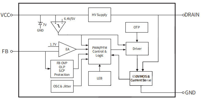 | 内置高压MOSFET | 650V耐压,RDS(on)约1.5Ω(典型值) |