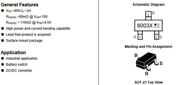 NCE6003X是新洁能推出的一款N沟道增强型功率MOSFET,采用先进的沟槽(Trench)工艺技术制造。该器件专为中等功率开关应用设计,在SOT-23小型封装内实现了60V耐压和3A电流能力,是电池保护、DC/DC转换等应用场景的理想选择。