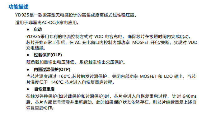 YD925是阻容降压方案的理想替代品,用一颗芯片替代了高压电容、限流电阻、稳压管等多个元件,外围极简、成本更低、可靠性更高。对于5V/30mA级别的小功率供电需求,如小家电控制板、智能灯具等应用,YD925是性价比最优的选择。